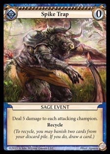 Spike Trap is another very interesting card. If Kark decks didn't already need the 0-cost Sage card spots for stuff like Muse, I think this card could really find a home. It seems you have to mass attack Kark and this card gets much better in that light. In Limited I think it's still very solid. You stand a good chance of killing a lot of champions with this card, or at least finishing off champions that you also block. It also Recycles which is very important. I love flexible 0-cost cards like this. My favorite plays are using it against my own Soul Hunter if it gets chump blocked, and using it against Thought Plucker and Knight of Shadows. It's a shame you have to wait til something attacks so this has a hard time getting Muse, but it's still a solid card.
